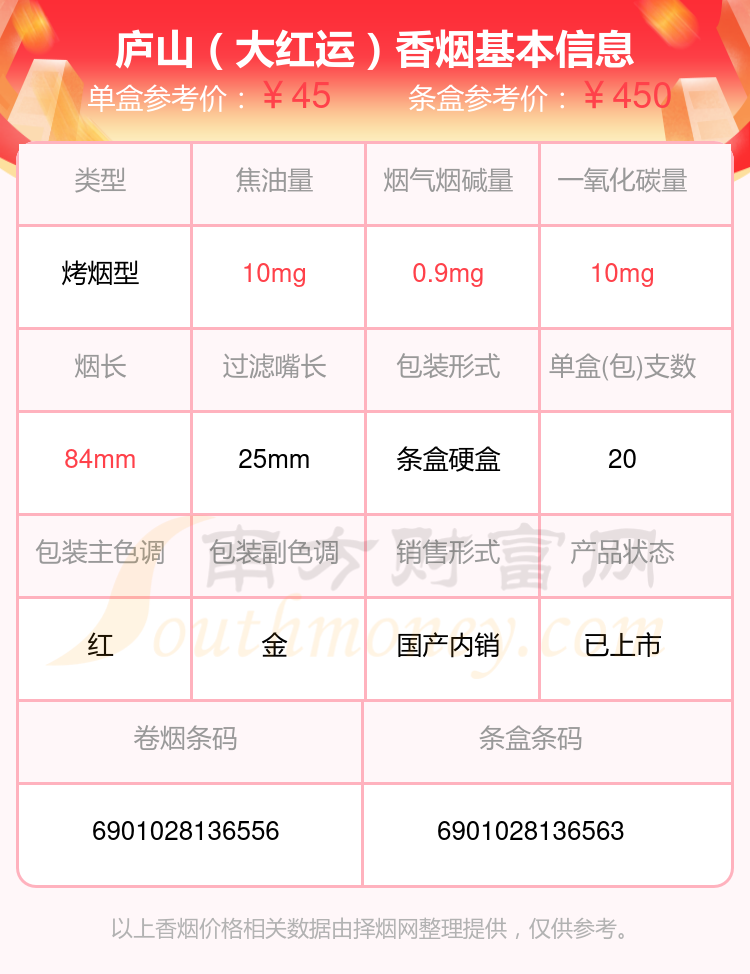 廬山(佳品)參考價(jià)5元/包、廬山(珍品)參考價(jià)7元/包、廬山(鴻運(yùn))參考價(jià)6元/包、廬山(好運(yùn))參考價(jià)4.0元/包、廬山(黃精品)參考價(jià)5.0元/包、廬山(精品)參考價(jià)5.0元/包、廬山(銀)參考價(jià)3元/包、廬山(大紅運(yùn))參考價(jià)45元/包、廬山(贛)參考價(jià)3元/包、廬山(新)參考價(jià)2.5元/包等。