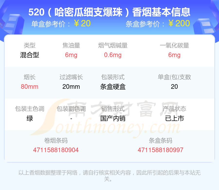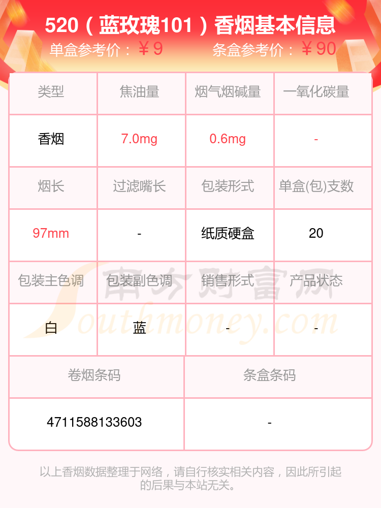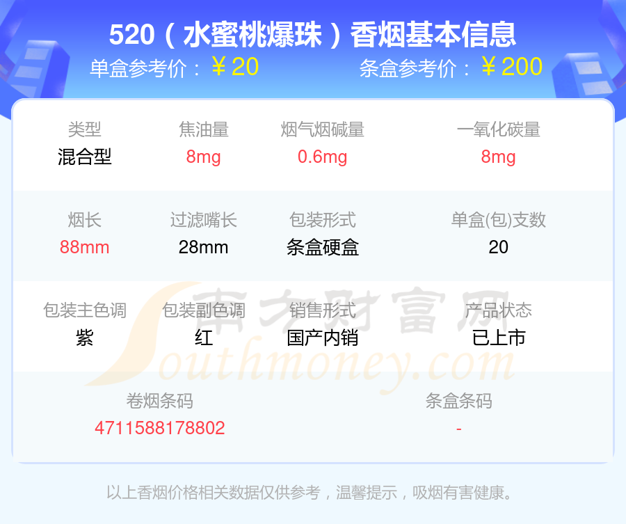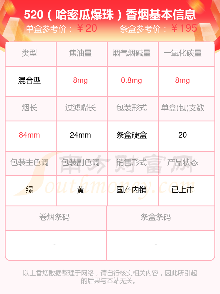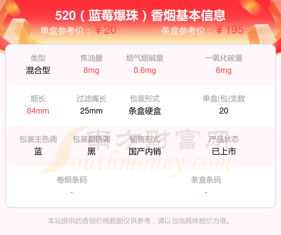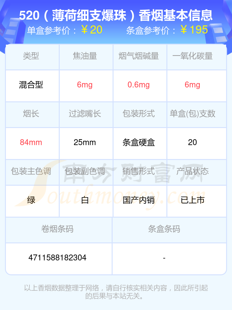520(SLIMS)參考價(jià)10.0元/包、520(藍(lán)莓爆珠)參考價(jià)20元/包、520(哈密瓜爆珠)參考價(jià)20元/包、520(蘋果爆珠)參考價(jià)20元/包、520(水蜜桃爆珠)參考價(jià)20元/包、520(薄荷)參考價(jià)10.0元/包、520(藍(lán)玫瑰101)參考價(jià)9.0元/包、520(薄荷細(xì)支爆珠)參考價(jià)20元/包、520(哈密瓜細(xì)支爆珠)參考價(jià)20元/包、520(玫瑰)參考價(jià)10元/包等。