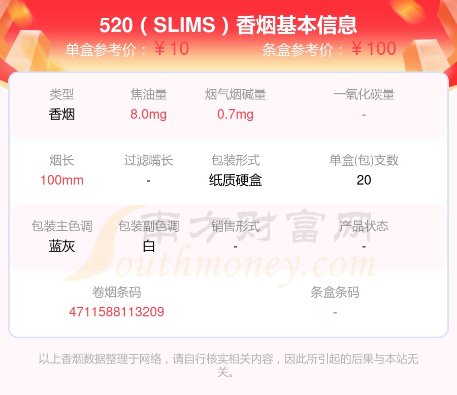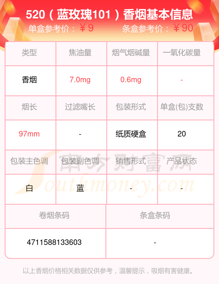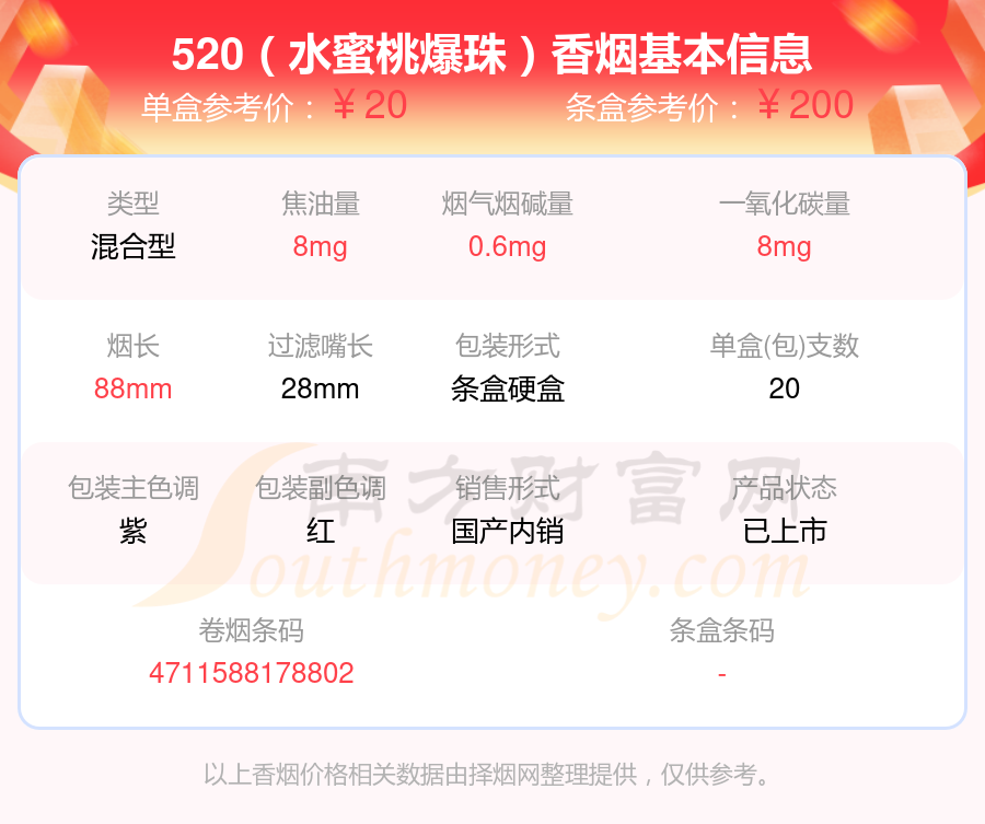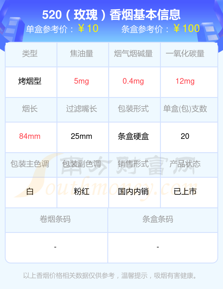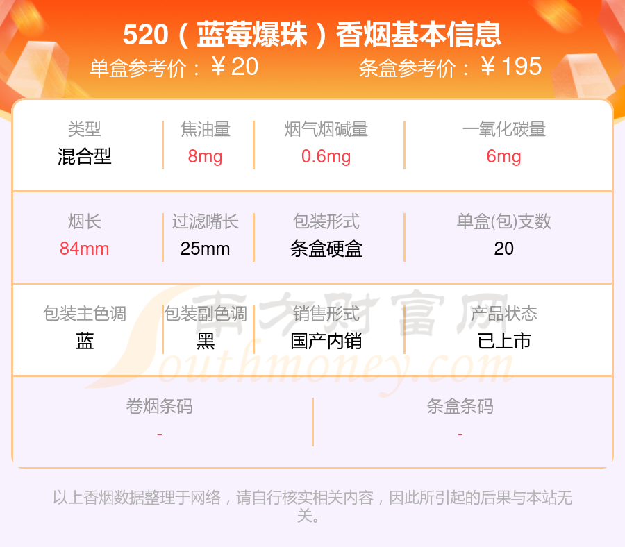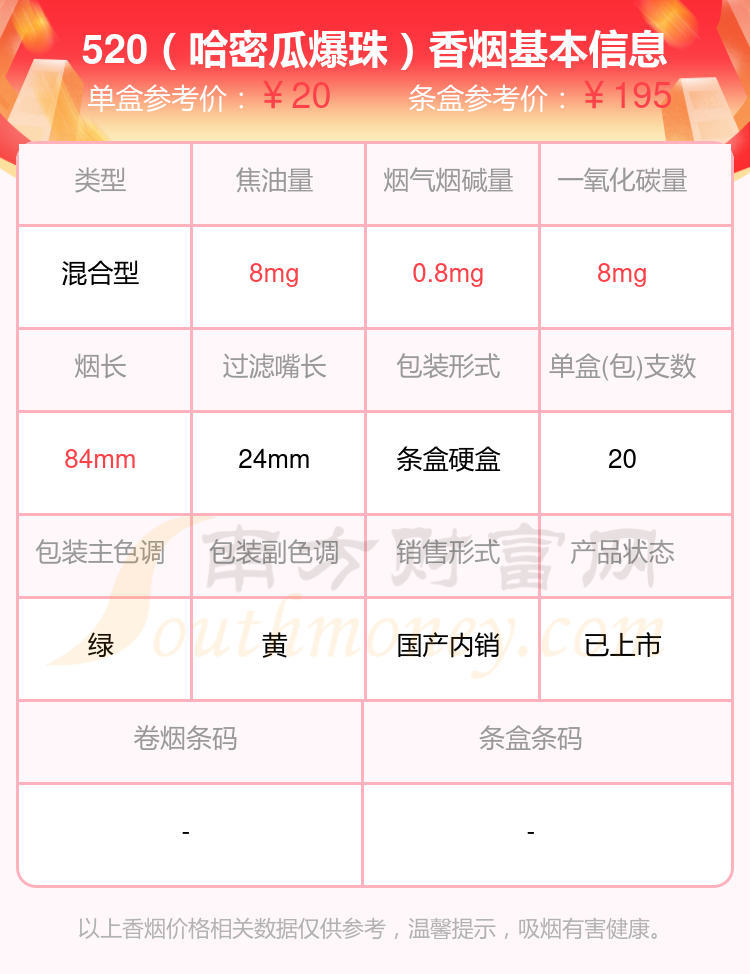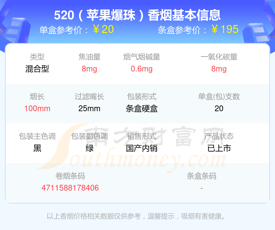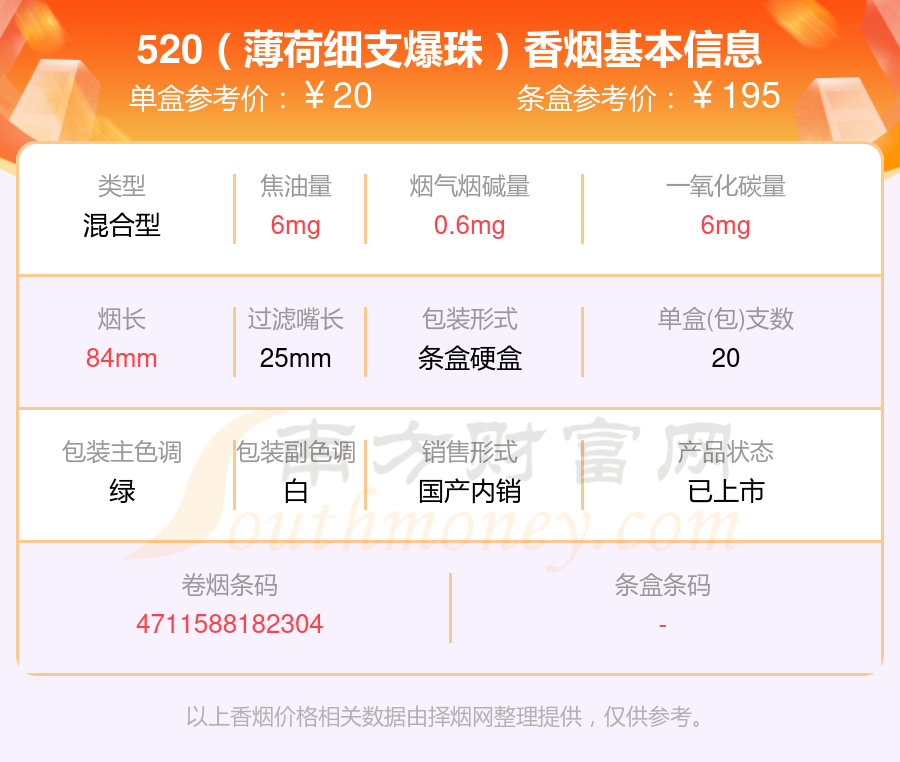 520香煙尼古丁低于10mg的煙有520(哈密瓜爆珠)、520(SLIMS)、520(薄荷)、520(薄荷細(xì)支爆珠)、520(藍(lán)莓爆珠)、520(蘋果爆珠)、520(哈密瓜細(xì)支爆珠)、520(藍(lán)玫瑰101)、520(水蜜桃爆珠)、520(玫瑰)等,詳細(xì)價(jià)格如下: