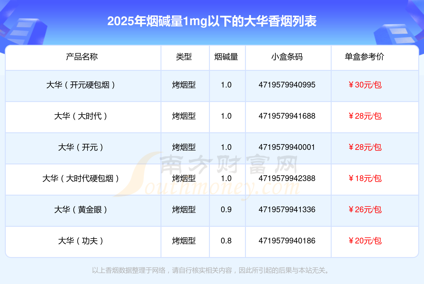 2025大華香煙煙堿量1mg以下的煙列表一覽