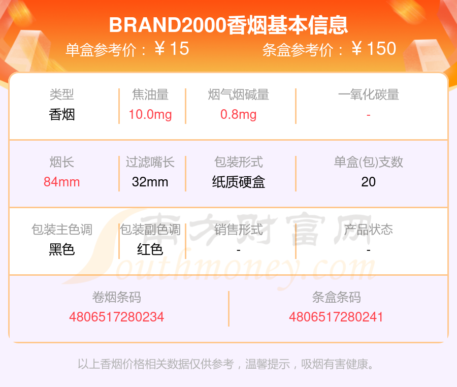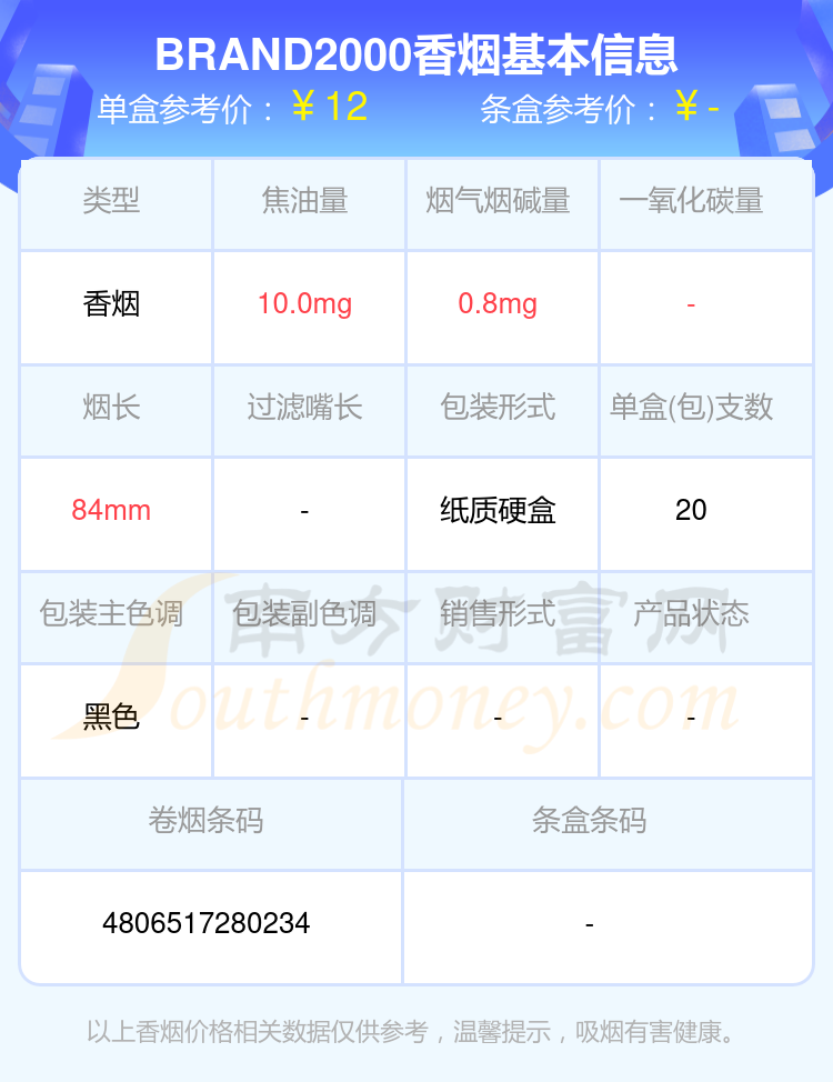 BRAND2000香煙煙堿2mg以下的煙有BRAND2000、BRAND2000等,詳細價格如下: