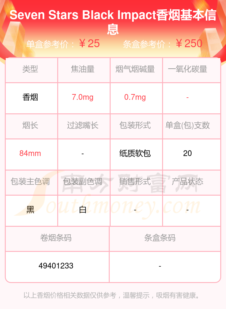 Seven Stars Black Impact香煙網(wǎng)友評分:口味評分為5.6,外觀評分為7.6,性價比評分為6,綜合得分為6.4。