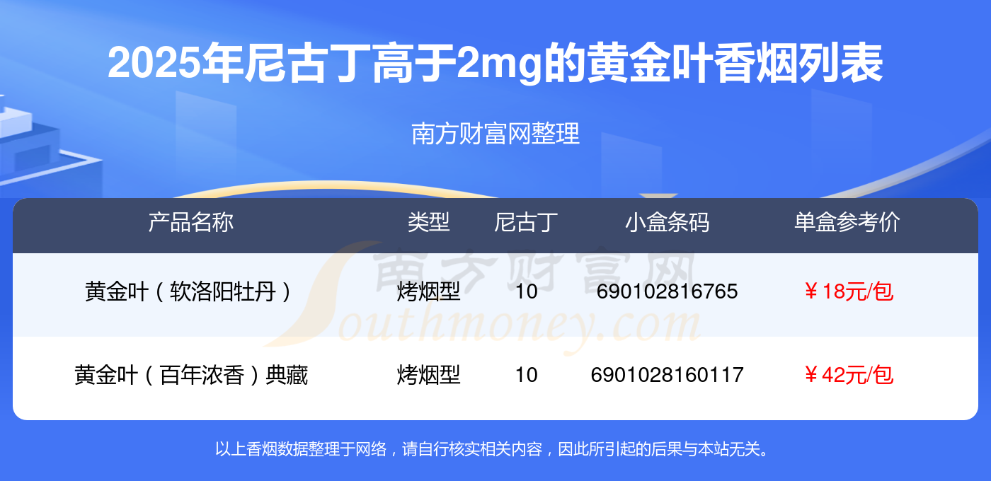 黃金葉香煙尼古丁高于2mg的煙有黃金葉(軟洛陽牡丹)、黃金葉(百年濃香)典藏等,詳細價格如下: