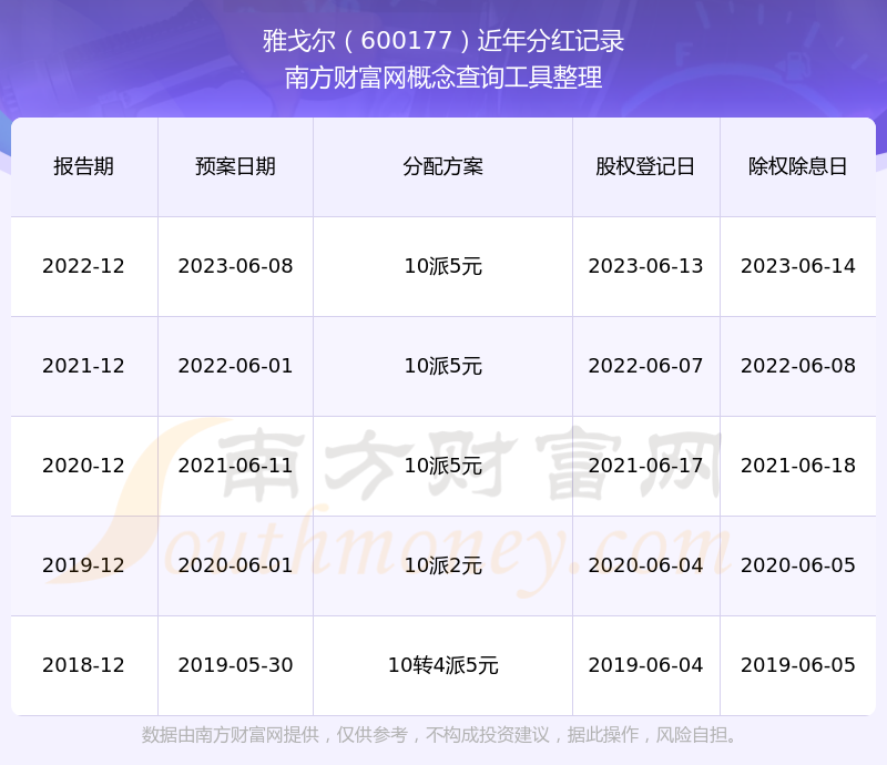 雅戈爾最新一次公布的分紅方案為10派5元。本次權(quán)益分派股權(quán)登記日為2023年6月13日,除權(quán)除息日為2023年6月14日,派息日為2023年6月14日。