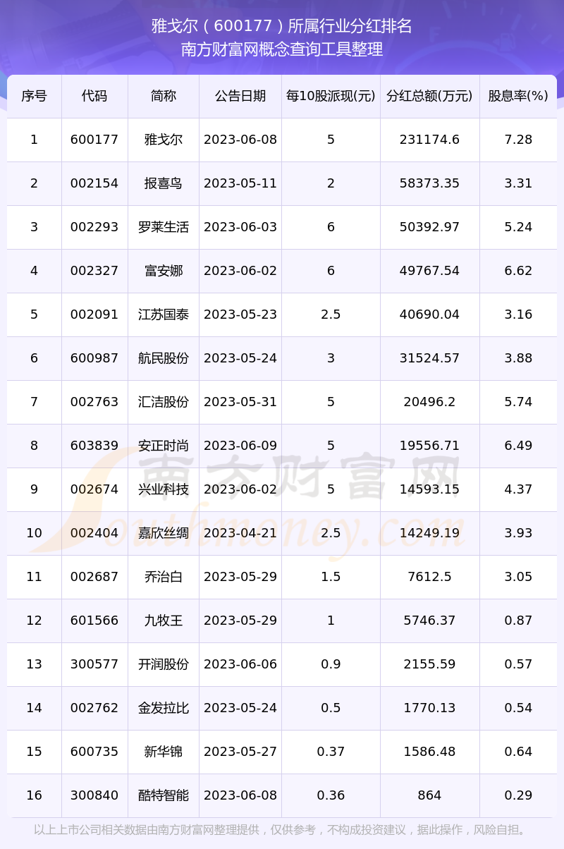 按照南方財富網(wǎng)趨勢選股系統(tǒng)統(tǒng)計,雅戈爾所屬行業(yè)為紡織服裝行業(yè),紡織服裝行業(yè)分紅排名情況如下表: