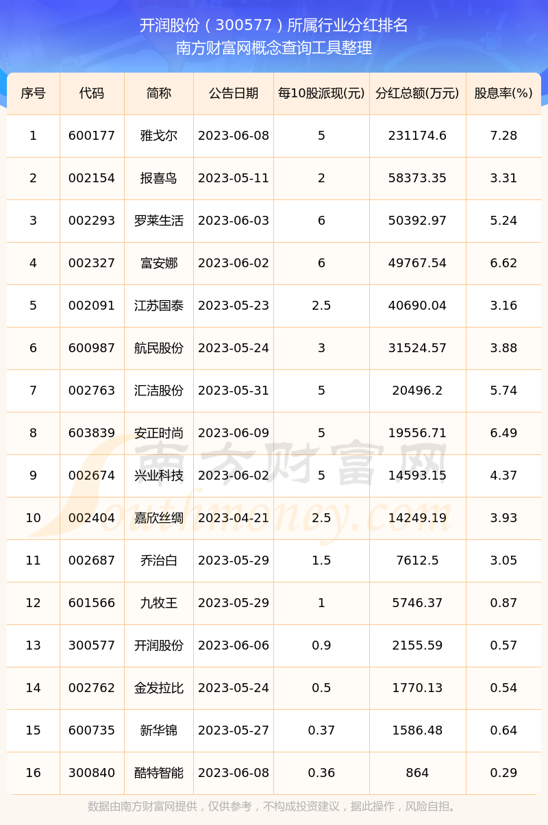 按照南方財富網(wǎng)趨勢選股系統(tǒng)統(tǒng)計,開潤股份所屬行業(yè)為紡織服裝行業(yè),紡織服裝行業(yè)分紅排名情況如下表: