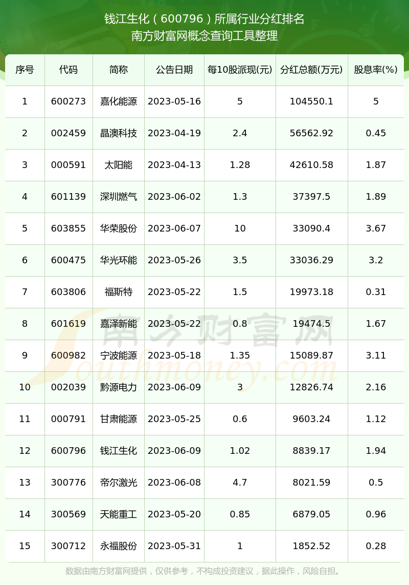 按照南方財富網(wǎng)趨勢選股系統(tǒng)統(tǒng)計,錢江生化所屬行業(yè)為天然氣行業(yè),天然氣行業(yè)分紅排名情況如下表: