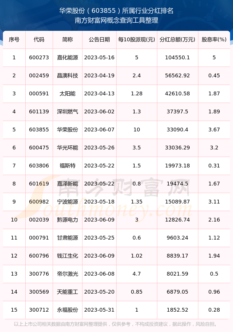 按照南方財富網(wǎng)趨勢選股系統(tǒng)統(tǒng)計,華榮股份所屬行業(yè)為太陽能行業(yè),太陽能行業(yè)分紅排名情況如下表: