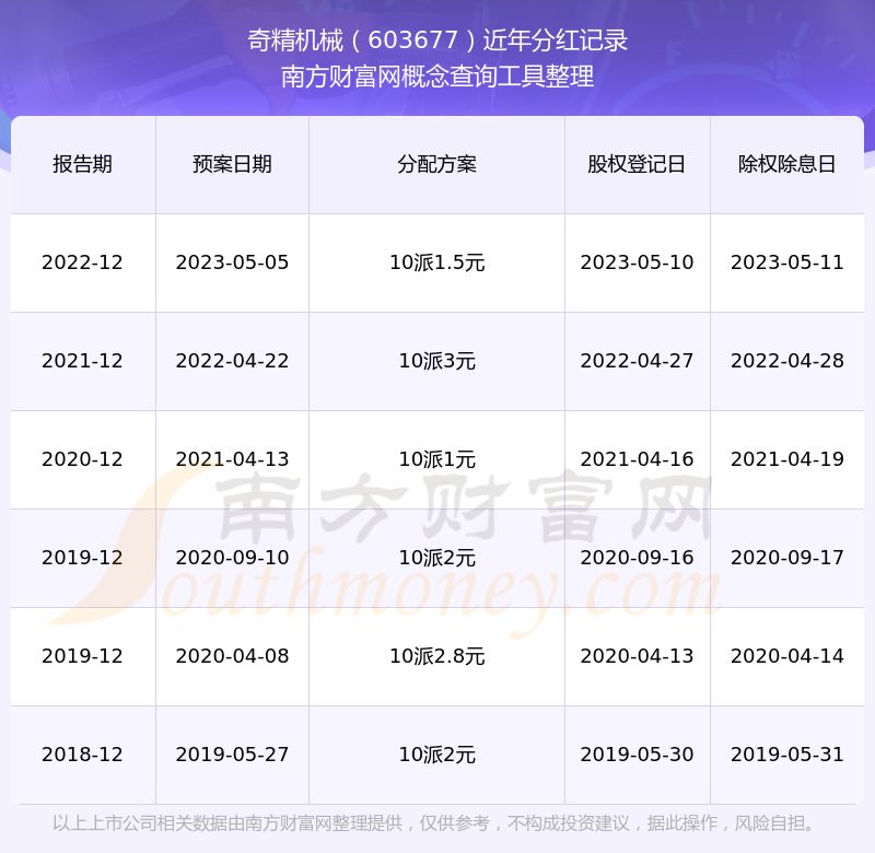 奇精機(jī)械最新一次公布的分紅方案為10派1.5元。本次權(quán)益分派股權(quán)登記日為2023年5月10日,除權(quán)除息日為2023年5月11日,派息日為2023年5月11日。