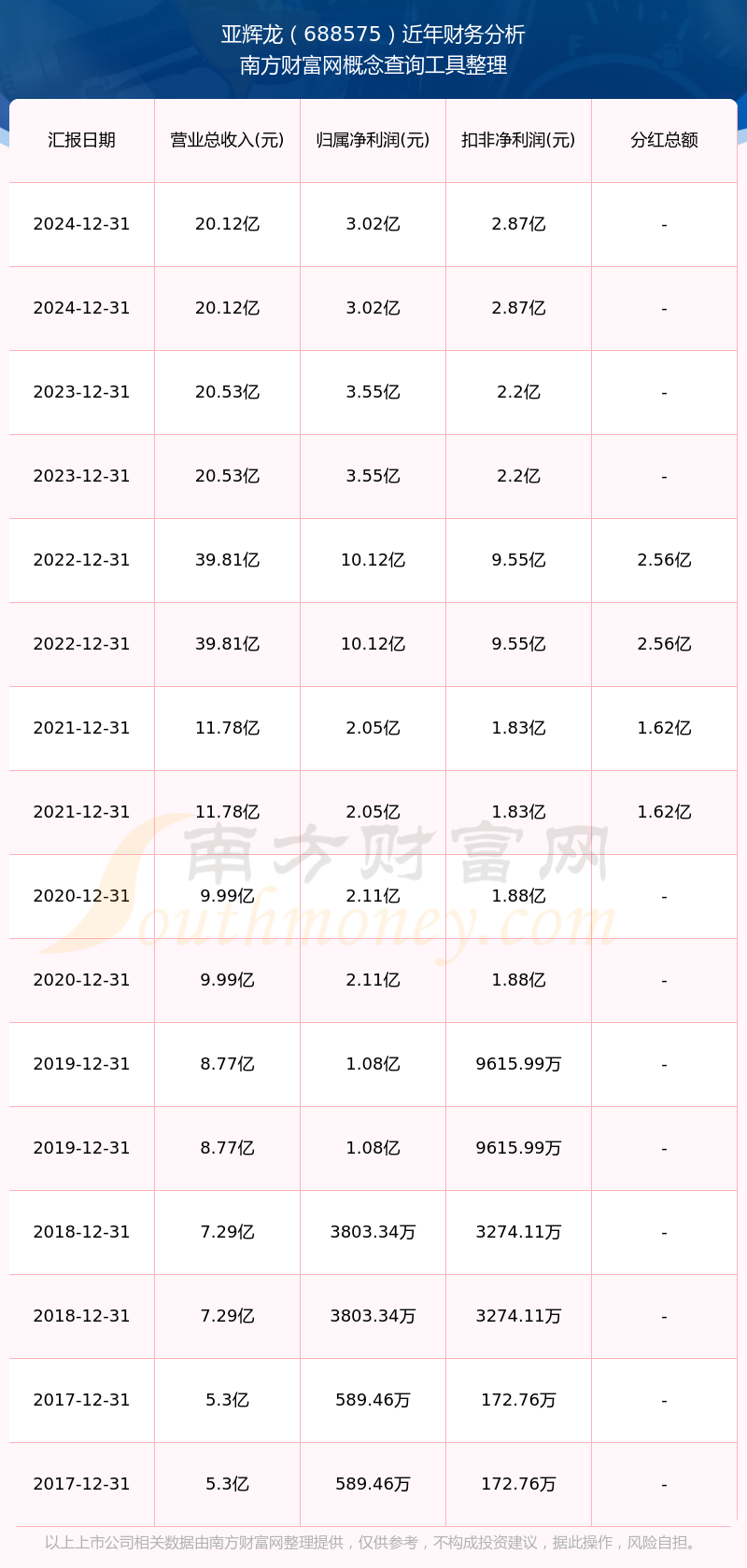 亞輝龍公司2024年實(shí)現(xiàn)營(yíng)業(yè)收入20.12億元,同比增長(zhǎng)-2.02%;凈利潤(rùn)3.02億元,同比增長(zhǎng)-15.06%;毛利率65.28%。