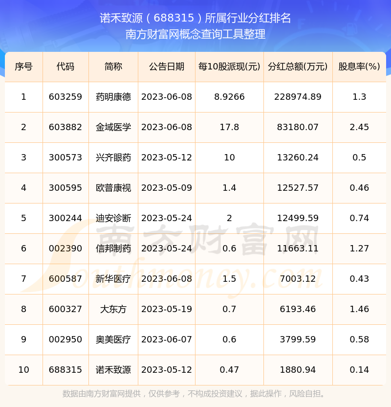 按照南方財(cái)富網(wǎng)趨勢(shì)選股系統(tǒng)統(tǒng)計(jì),諾禾致源所屬行業(yè)為醫(yī)學(xué)研究行業(yè),醫(yī)學(xué)研究行業(yè)分紅排名情況如下表: