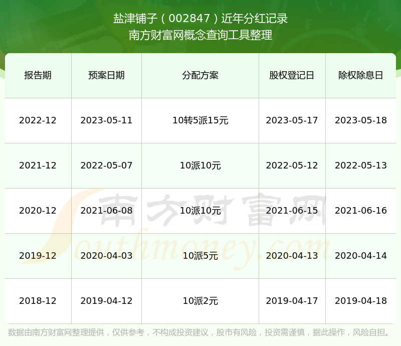 鹽津鋪?zhàn)幼钚乱淮喂嫉姆旨t方案為10轉(zhuǎn)5派15元。本次權(quán)益分派股權(quán)登記日為2023年5月17日,除權(quán)除息日為2023年5月18日,派息日為2023年5月18日。
