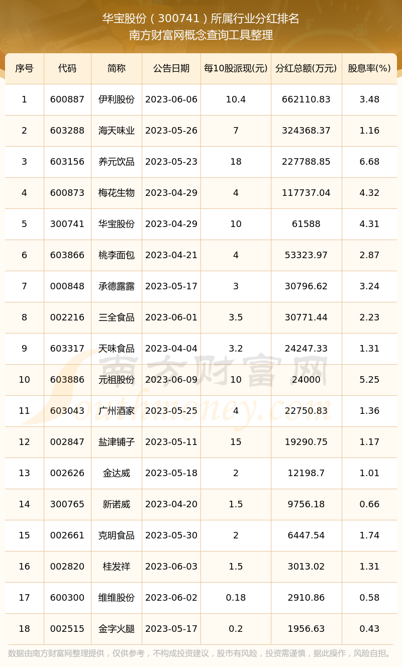 華寶股份最新一次公布的分紅方案為10派10元。本次權(quán)益分派股權(quán)登記日為2023年5月9日,除權(quán)除息日為2023年5月10日,派息日為2023年5月10日。