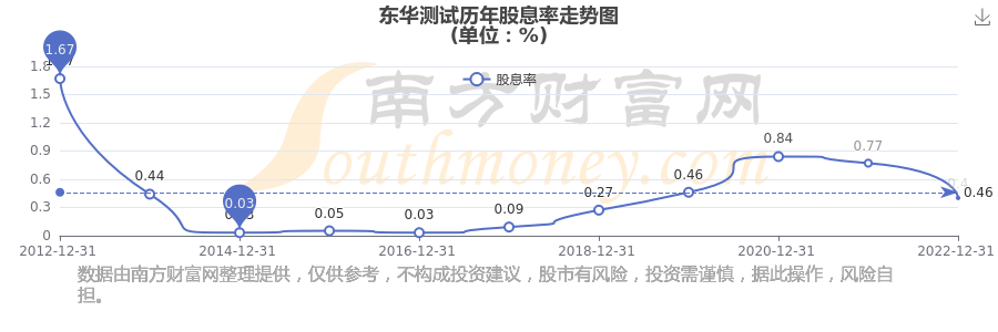 近年?yáng)|華測(cè)試年度股息率走勢(shì)如下圖:
