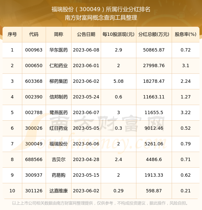 按照南方財富網(wǎng)趨勢選股系統(tǒng)統(tǒng)計,福瑞股份所屬行業(yè)為醫(yī)療器械行業(yè),醫(yī)療器械行業(yè)分紅排名情況如下表: