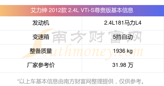 艾力紳 2012款 2.4L VTi-S尊貴版動(dòng)力上搭載的是一臺(tái)2.4L181馬力L4自然吸氣發(fā)動(dòng)機(jī),匹配5擋自動(dòng)檔變速箱,燃料形式為汽油,常規(guī)整備質(zhì)量1936kg,廠家參考價(jià)31.98萬(wàn)元。