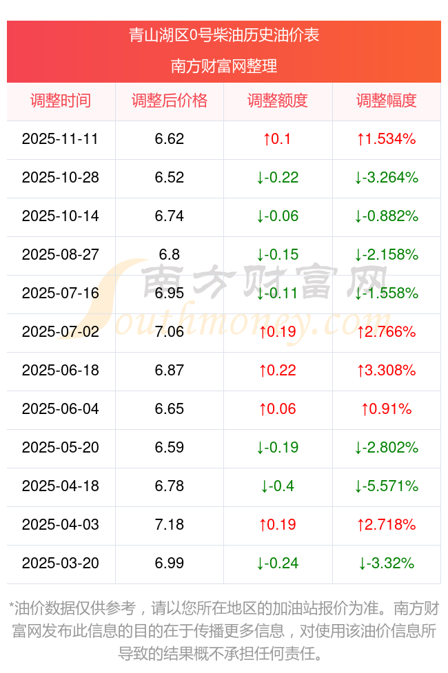 青山湖區(qū)0號(hào)柴油歷史油價(jià)表