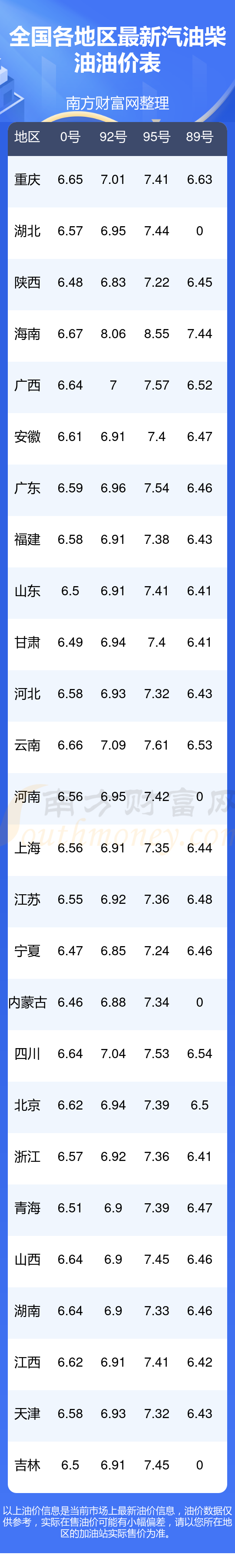 油價數(shù)據(jù)僅供參考,請以您所在地區(qū)的加油站報價為準。南方財富網(wǎng)發(fā)布此信息的目的在于傳播更多信息,對使用該油價信息所導致的結果概不承擔任何責任。