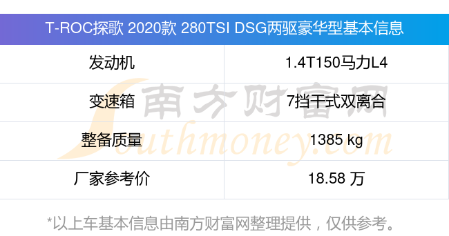 T-ROC探歌 2020款 280TSI DSG兩驅(qū)豪華型動力上配備的是一臺1.4T150馬力L4渦輪增壓發(fā)動機,匹配的是7擋干式雙離合自動檔變速箱,燃料形式為汽油,常規(guī)整備質(zhì)量1385kg,廠家參考價18.58萬元。