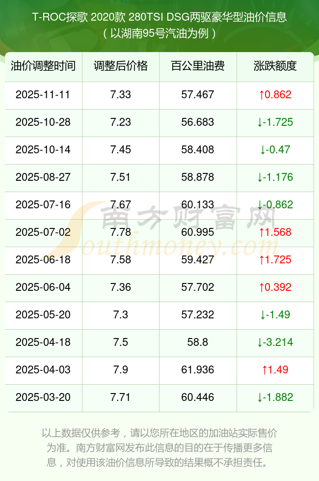 根據(jù)11月11日95號汽油最新調(diào)整價格7.33元/升來計算(以湖南為例),該車型每百公里的平均油費是57.467元,上一輪10月28日調(diào)整價格7.23元每升來計算,每百公里的平均油費是56.683元,對比上一輪多花0.862元,下一輪的油價調(diào)整時間是11月24日24時。