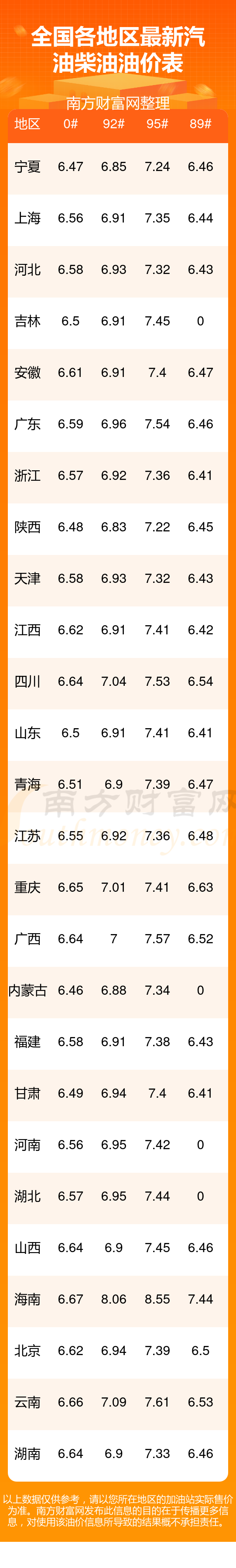 以上數(shù)據(jù)僅供參考,請以您所在地區(qū)的加油站實際售價為準。南方財富網(wǎng)發(fā)布此信息的目的在于傳播更多信息,對使用該油價信息所導致的結(jié)果概不承擔責任。