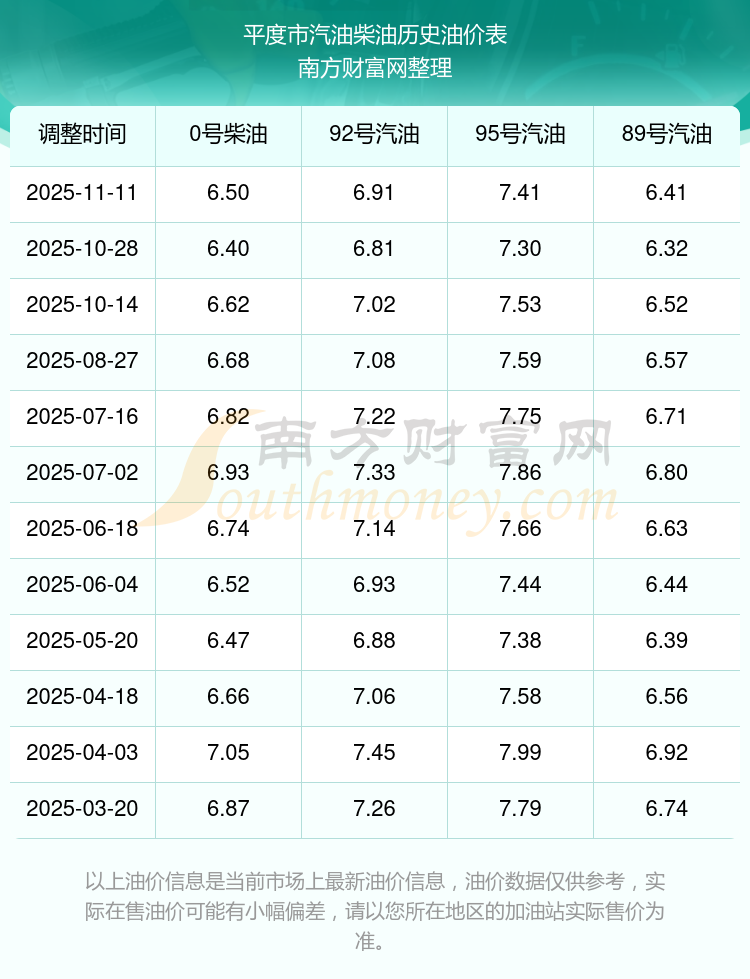 平度市汽油、柴油11月15日每升的價格具體是(11月11日調(diào)整后的價格):92號汽油6.91元;95號汽油7.41元;89號汽油6.41元;0號柴油6.5元。