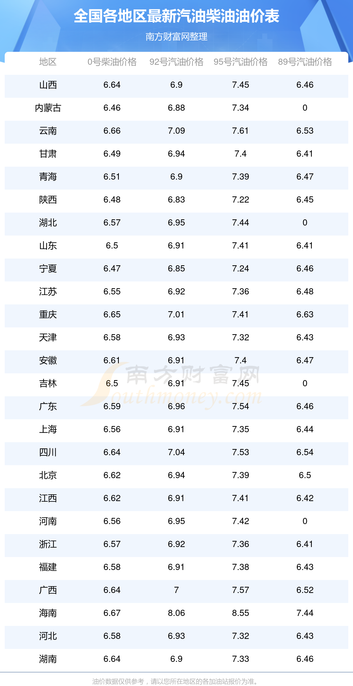 油價調(diào)整最新消息:本輪油價的調(diào)整時間為11月11日,調(diào)整后全國92號汽油平均價格為7元每升,其中,最低為陜西的6.83元/升,最高為海南的8.06元/升。全國95號汽油平均價格為7元每升,其中,最低為陜西的7.22元/升,最高為海南的8.55元/升。全國0號柴油平均價格為:7元每升,其中,最低為內(nèi)蒙古的6.46元/升,最高為海南的6.67元/升。全國89號汽油平均價格為7元每升,其中,最低為浙江的6.41元/升,最高為海南的7.44元/升。下一輪汽油價格調(diào)整時間11月24日24時,距離現(xiàn)在還有9.51天。