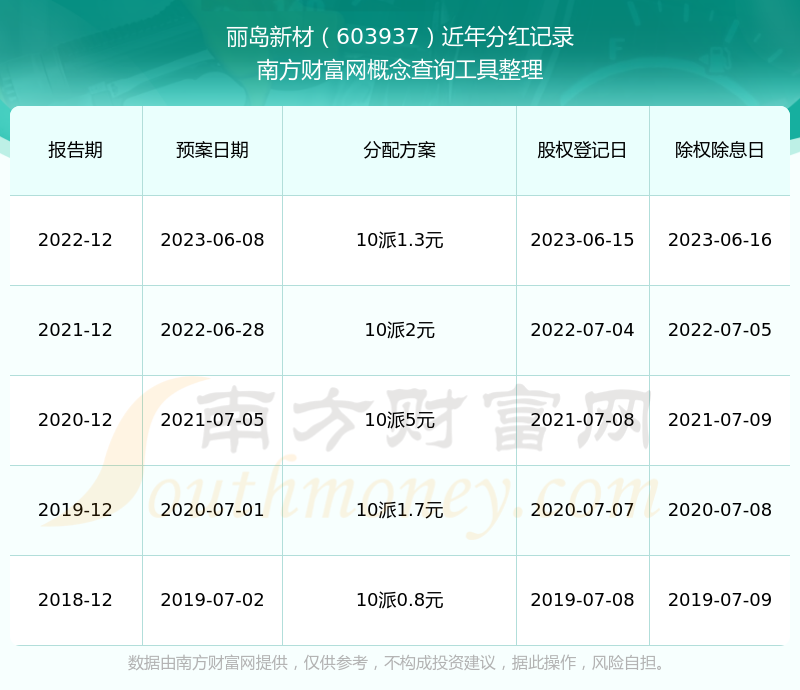麗島新材最新一次公布的分紅方案為10派1.3元。本次權(quán)益分派股權(quán)登記日為2023年6月15日,除權(quán)除息日為2023年6月16日,派息日為2023年6月16日。
