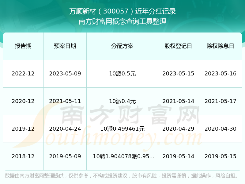 萬順新材最新一次公布的分紅方案為10派0.5元。本次權(quán)益分派股權(quán)登記日為2023年5月15日,除權(quán)除息日為2023年5月16日,派息日為2023年5月16日。