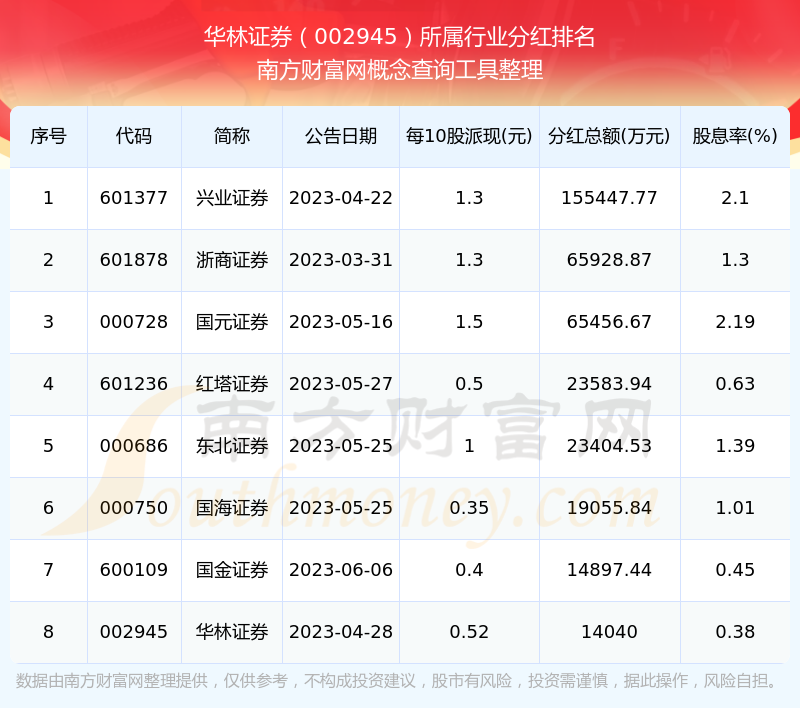 按照南方財富網(wǎng)趨勢選股系統(tǒng)統(tǒng)計,華林證券所屬行業(yè)為證券經(jīng)紀(jì)行業(yè),證券經(jīng)紀(jì)行業(yè)分紅排名情況如下表: