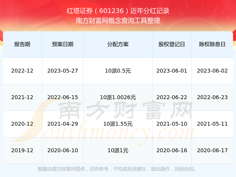 紅塔證券最新一次公布的分紅方案為10派0.5元。本次權(quán)益分派股權(quán)登記日為2023年6月1日,除權(quán)除息日為2023年6月2日,派息日為2023年6月2日。