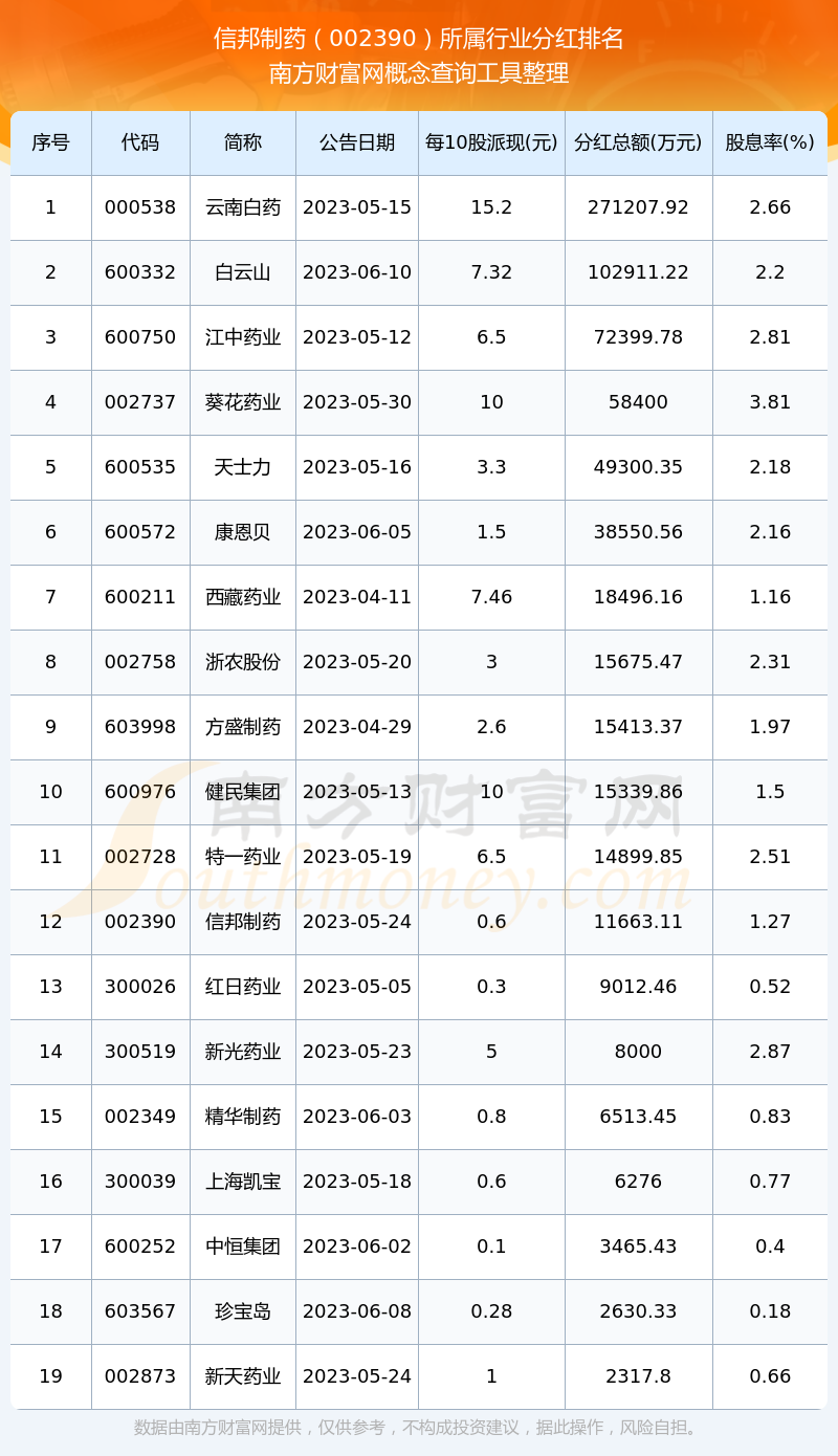 按照南方財富網(wǎng)趨勢選股系統(tǒng)統(tǒng)計,信邦制藥所屬行業(yè)為中藥行業(yè),中藥行業(yè)分紅排名情況如下表: